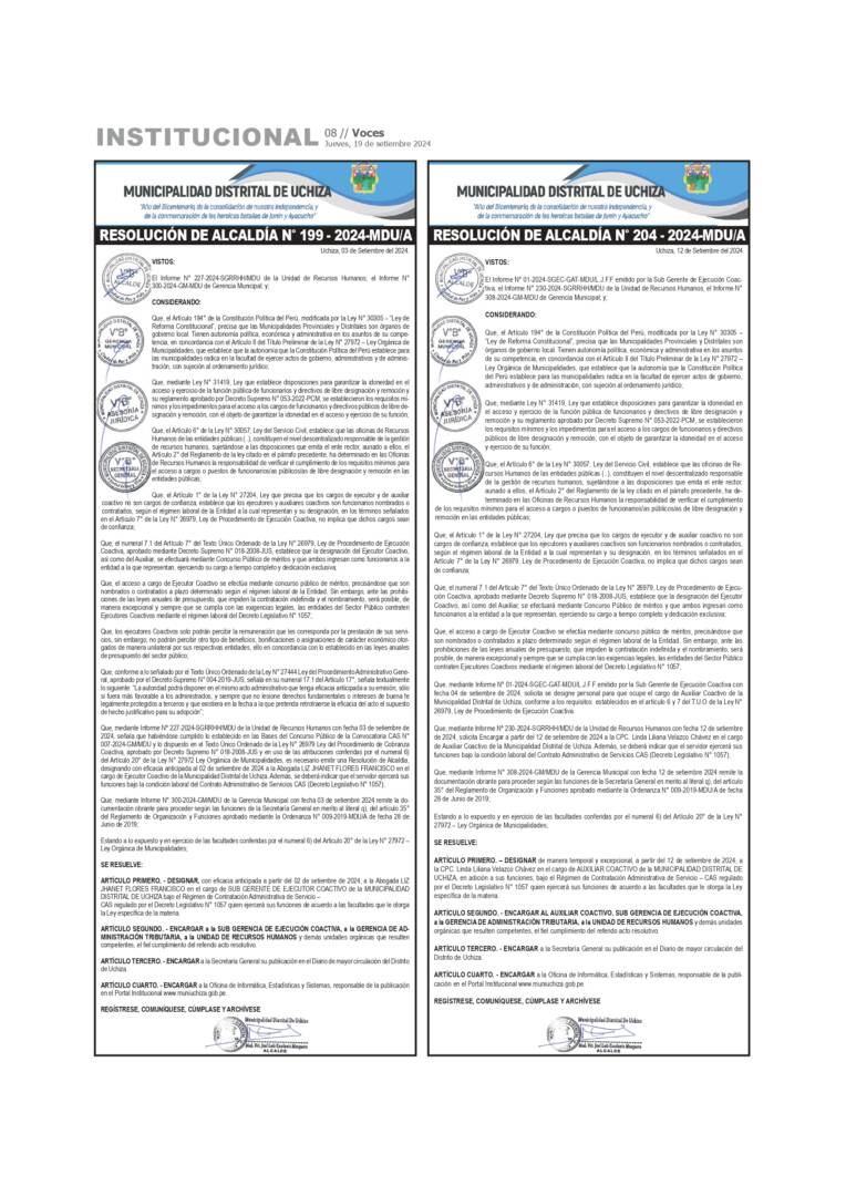 Actualidad Municipalidad Distrital de Uchiza: Resolucion de Alcaldia N° 199 – 2024-MDU/A y Resolucion de Alcaldia 19/09/2024